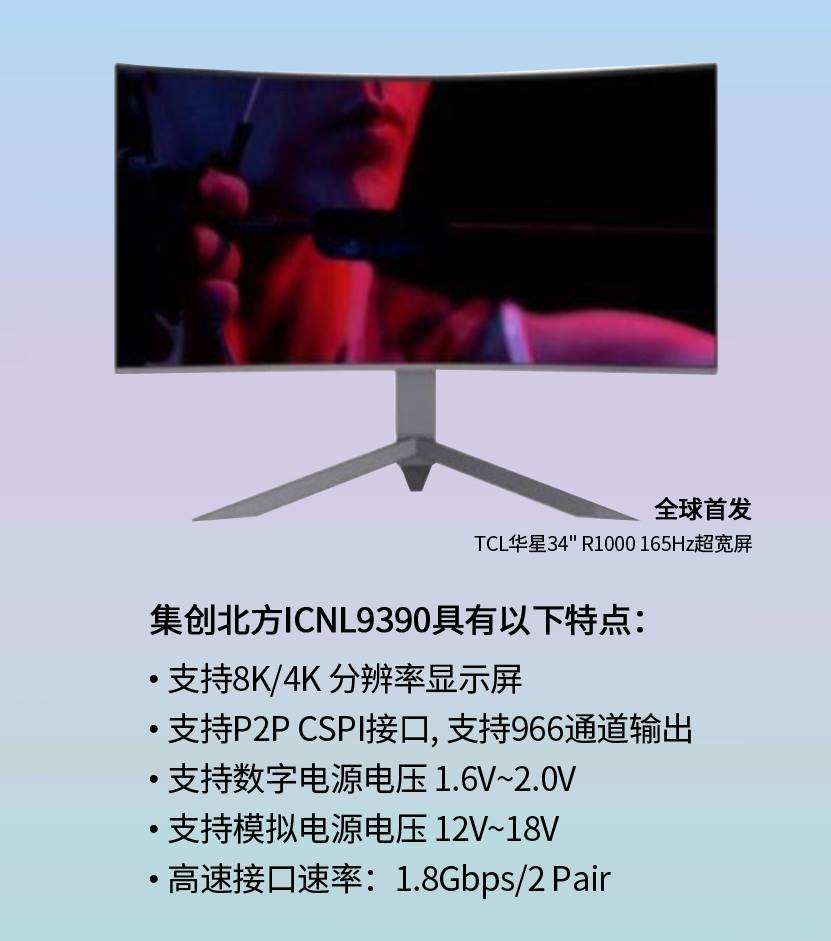 本月初,在2021年英雄聯(lián)盟全球總決賽中,中國戰(zhàn)隊EDG力克韓國對手,捧回了總冠軍的榮譽。然而中國與日韓之間在電子競技方面的爭霸,并不僅僅局限于體育運動項目這一層面。在電競相關的顯示硬件領域,以TCL華星光電技術有限公司(簡稱“TCL華星”)為代表的中國面板顯示企業(yè),也積極布局8K超高清和OLED等新型顯示技術,與日韓企業(yè)展開了一場你爭我奪的創(chuàng)新之戰(zhàn)。集創(chuàng)北方作為國內(nèi)完整顯示芯片解決方案的提供商,憑借自身十余年在顯示芯片研發(fā)中所積淀的科研實力和創(chuàng)新能力,將攜手TCL華星在新型電競屏的研發(fā)制造中躋身世界前列。圖1:TCL華星全球首款 34”R1000 165Hz 超寬電競屏 北京集創(chuàng)北方科技股份有限公司(簡稱“集創(chuàng)北方”)自主研發(fā)的8K LCD超高清顯示驅(qū)動芯片ICNL9390,曾斬獲SID“2019年度最佳創(chuàng)新顯示組件金獎”和CUVA“優(yōu)秀創(chuàng)新產(chǎn)品與解決方案獎”兩項行業(yè)大獎,其在半壓電路,抑制技術、高頻輸入接口技術、高性能輸出運算放大器方案、低功耗設計等方面實現(xiàn)了創(chuàng)新突破。因此其在成功通過TCL華星的生產(chǎn)驗證后,被應用于其全球首款34”R1000 165Hz 超寬電競屏。此款電競屏憑借21:9 屏幕比例、3440×1440 分辨率、165Hz的高刷新率,以及R1000 產(chǎn)品曲率,成為高端電競玩家體驗更具震撼力和感染力的視覺沖擊,并享受流暢畫質(zhì)的硬件神器。