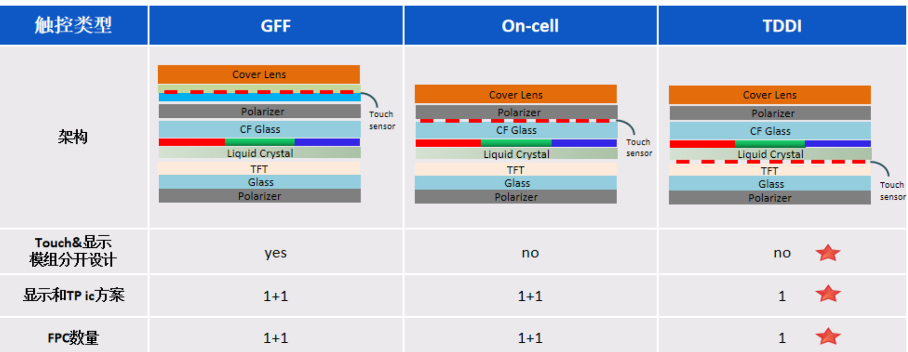 2. On-cell方案是指將Touch sensor嵌入到顯示屏的彩色濾光片基板和偏光片之間,即touch sensor做到顯示上玻璃,顯示和觸控模組二合一了,但ic和FPC還是分開(kāi)兩套設(shè)計(jì)。3. TDDI方案將Touch sensor完全集成到了顯示TFT面板內(nèi),實(shí)現(xiàn)了顯示觸控模組、IC以及FPC全部二合一,為顯示觸控高度集成一體化方案。