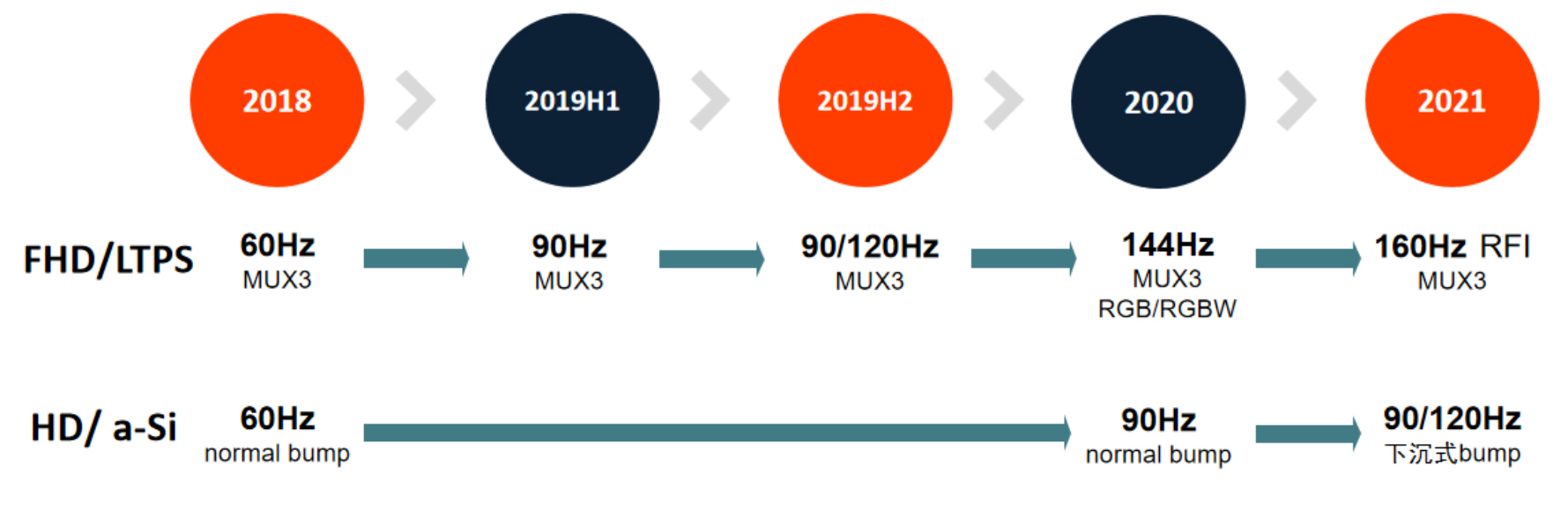 HD a-Si TDDI已實(shí)現(xiàn)90Hz量產(chǎn),新開(kāi)下沉式bump ic已可支援120Hz,針對(duì)HD 120Hz規(guī)格顯示屏已不是瓶頸且沒(méi)有成本的增加,待有成本匹配的主板套片,終端對(duì)應(yīng)規(guī)劃開(kāi)案,HD也將有可能升級(jí)為120Hz。