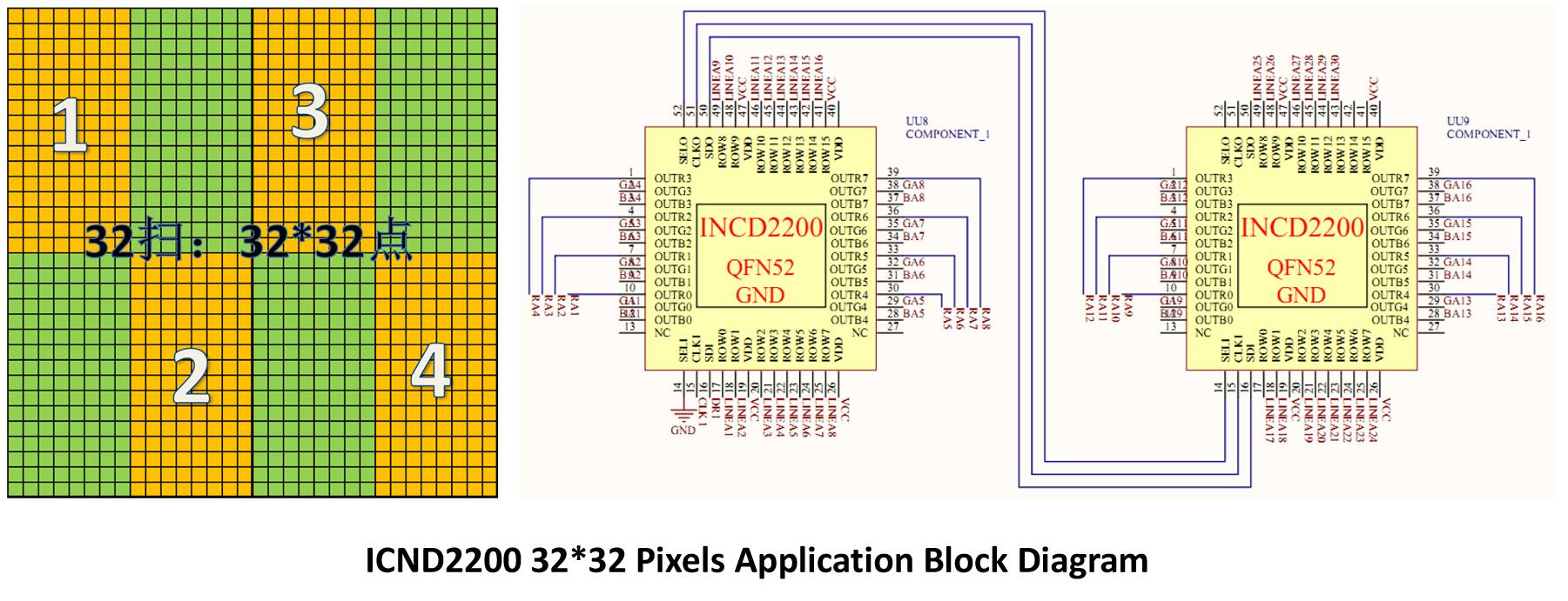 ICND2200采用創(chuàng)新的行列合一架構(gòu),內(nèi)部集成24個恒流通道及16個行管,通過芯片級聯(lián)可擴(kuò)展實(shí)現(xiàn)最大到32掃的區(qū)域控制,未來可升級到支持48掃和64掃。芯片級聯(lián)區(qū)域中行列共用組成控制區(qū)域,16掃應(yīng)用下,單顆芯片控制區(qū)域?yàn)?6行*8列;對應(yīng)32掃,兩顆芯片級聯(lián)控制區(qū)域?yàn)?2行*16列,下圖為32*32點(diǎn)控制區(qū)域示意圖,只需4顆ICND2200級聯(lián)擴(kuò)展即可。