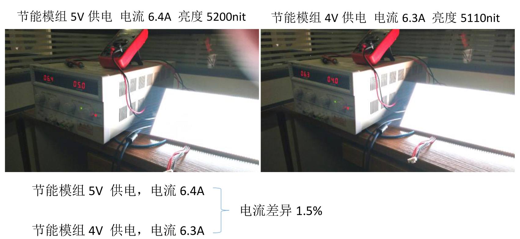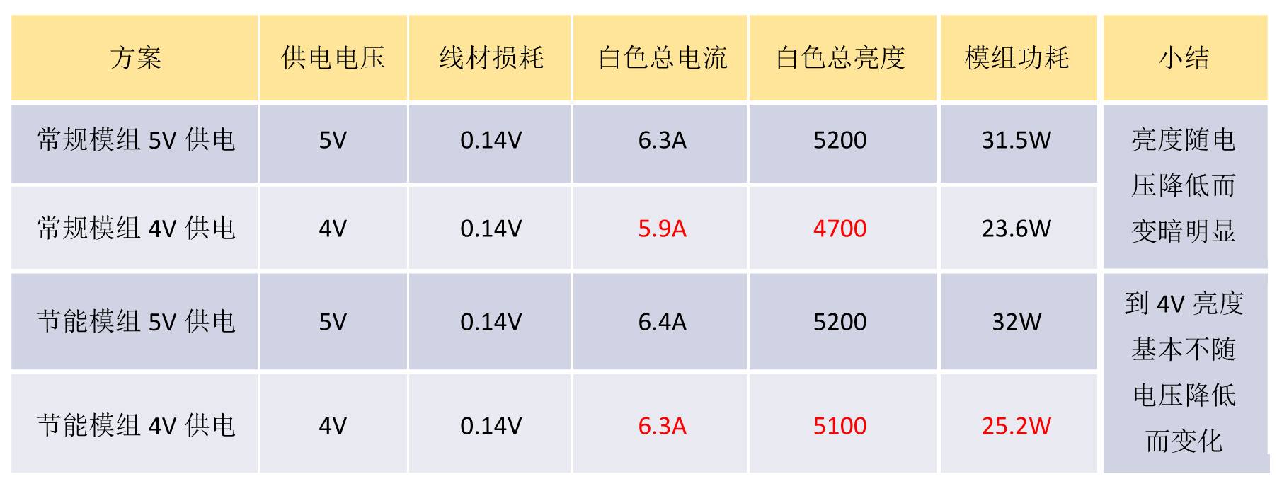 經(jīng)測試P5和P8的模組均可使用4V電壓供電保證模組電流、亮度、顏色無變化,實測節(jié)能比例可達(dá)21%。