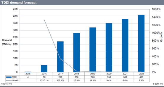 過去因 TDDI IC 單價偏高,導致整體 In-Cell 面板模組報價居高不下,但隨著面板廠與 IC 設計廠商持續(xù)針對產品進行優(yōu)化,TDDI IC 降價速度加快,也可望加速提升整體 In-Cell 的滲透率。預計 2018 年, In-Cell 方案的滲透率將達 37.6%,其中搭載 TDDI IC 的 In-Cell 產品比重也有機會提升至 22%。
